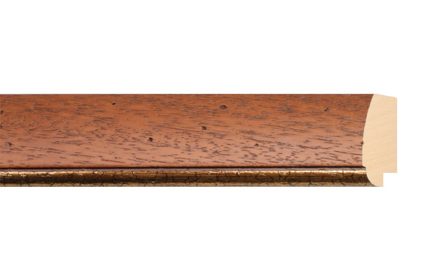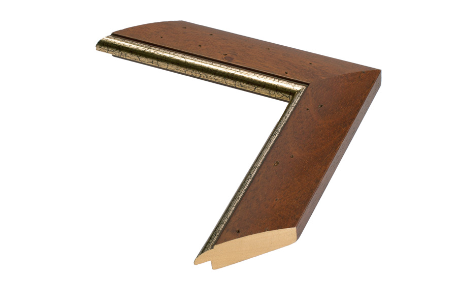 Moldura clássica castanha com friso dourado com marcas propositadas que pretendem recriar os furos provocados pelo bicho da madeira. Moldura em madeira ayous, com acabamento em anilina castanha, poro aberto, e com friso em filme de cor ouro.