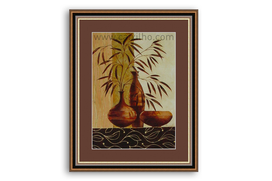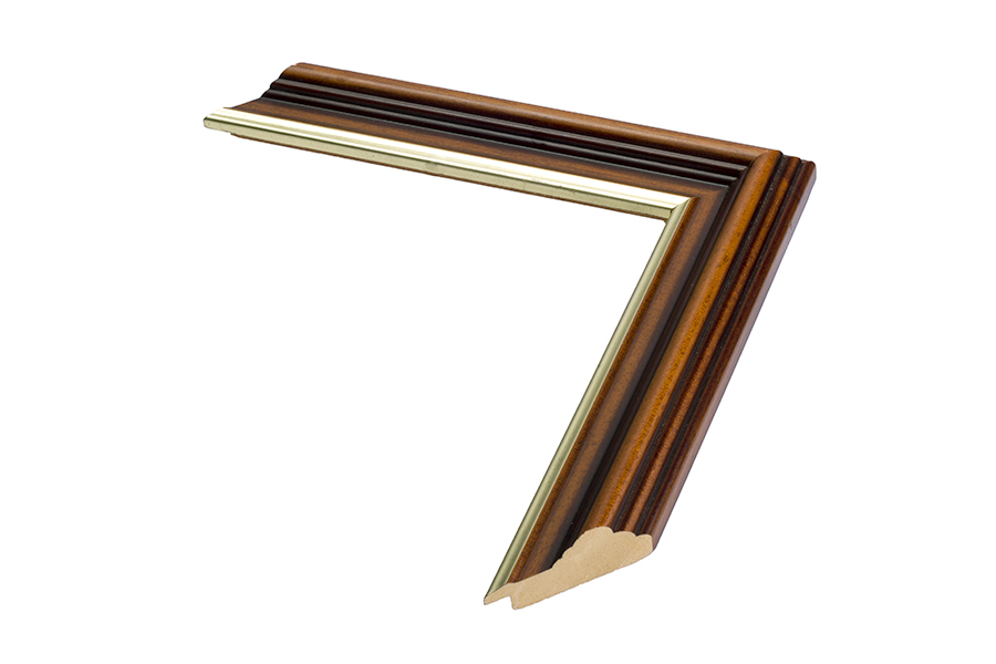 Moldura em madeira ayous, com acabamento em anilina castanha, pátina preta com friso em filme de cor ouro.