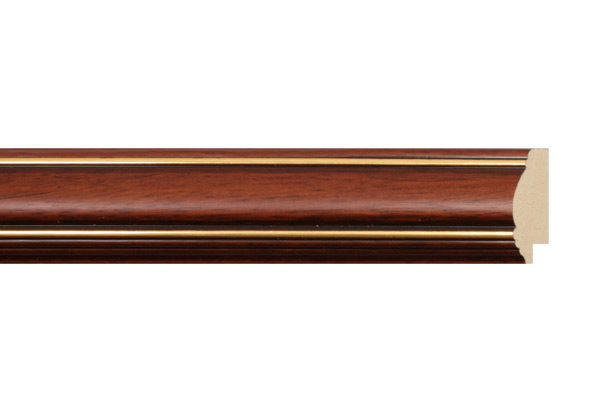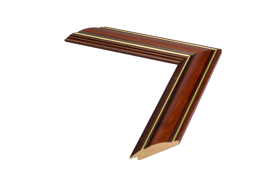 Moldura em madeira ayous, com acabamento em anilina castanha, poro aberto e com dois frisos em filme de ouro