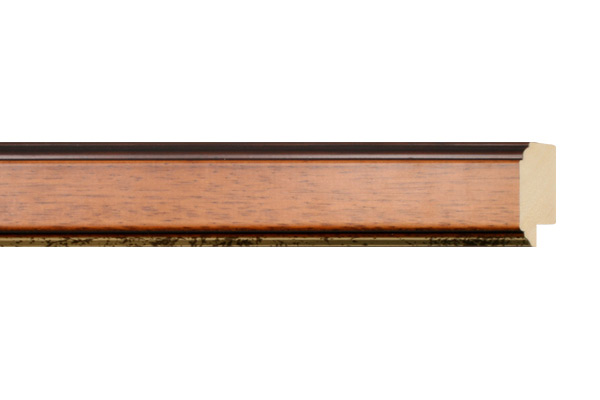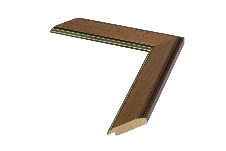 Moldura em madeira ayous, com acabamento em anilina castanha, com pátina preta e com friso em filme de cor ouro.