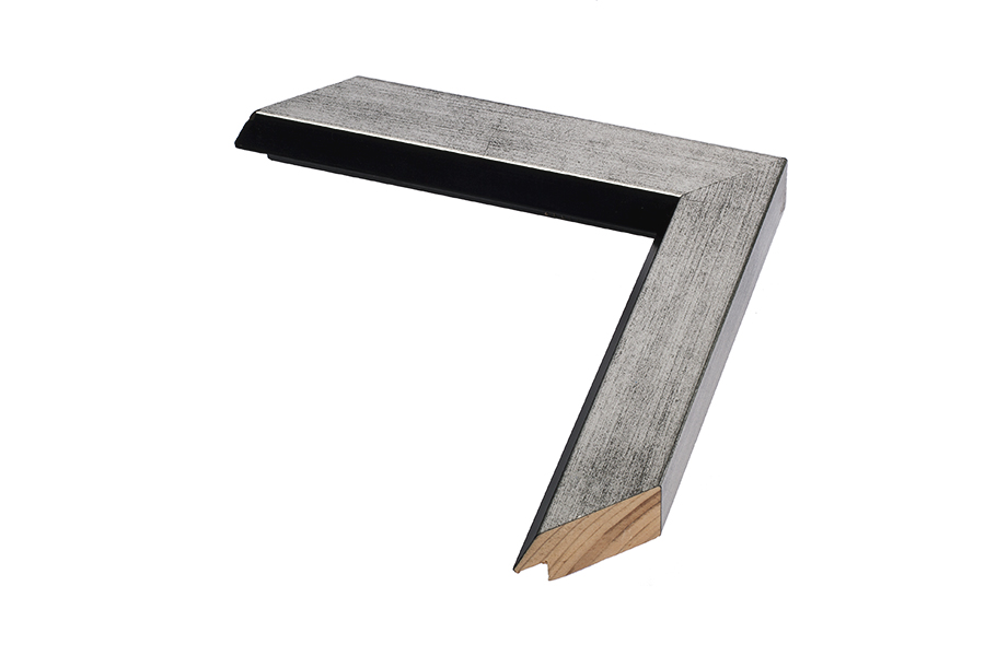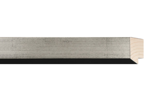 Moldura em madeira pinho juntado, com acabamento em filme de cor prata e friso em lacado preto fosco.