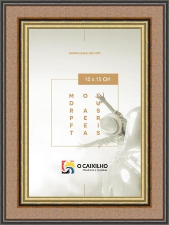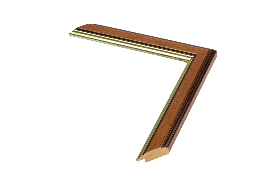 Moldura em madeira ayous, com acabamento em anilina castanha e com friso em filme de cor ouro.