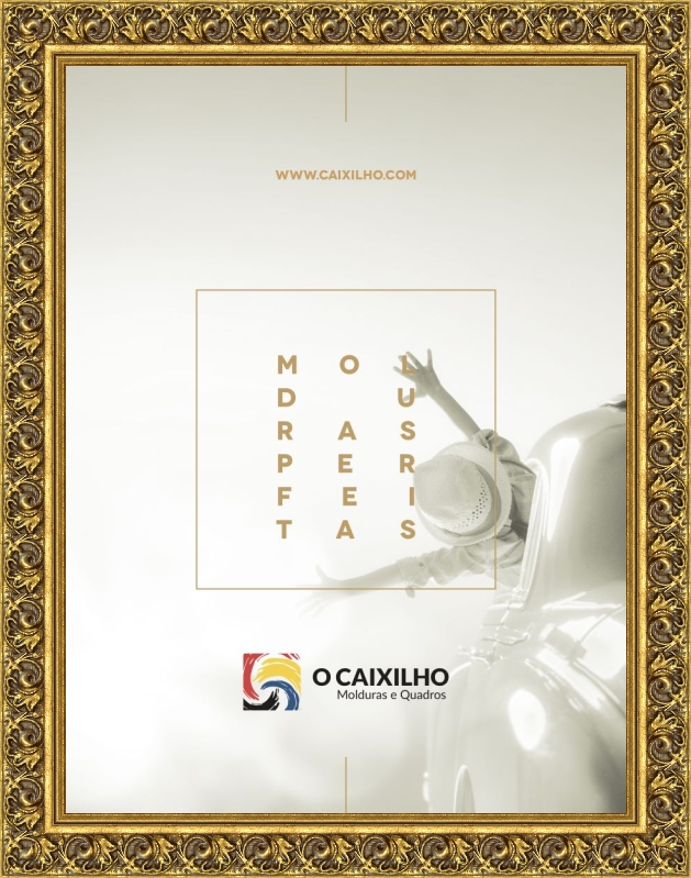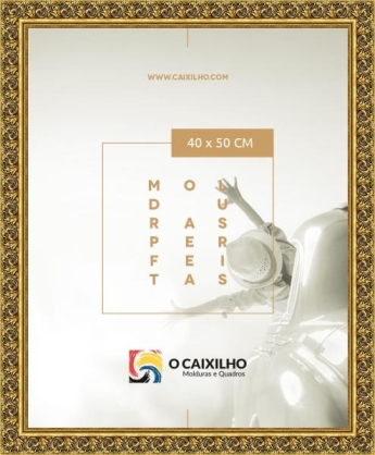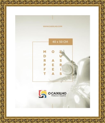 Moldura trabalhada dourada, de 3.5 cm de largura, ideal para fotos, posters, pinturas e quadros nos tamanhos mais populares.